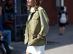 블랙진에 화이트 잠옷 가운과 같은 자켓을 코디하여 블랙앤화이트 스타일로 파자마룩을 제안한 모습이다. 클래식한 가방과 선글라스를 매치한 것도 돋보이는 스타일링 방법이다.
