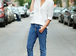 뉴트럴한 컬러의 티셔츠를 경쾌하게 스타일링할 때 소매부부늘 롤업하고 셔츠 한쪽을 바지 밖으로 꺼내 디테일을 살리는 것이 포인트. 단, 목을 가리는 디자인은 답답해 보일 수 있으므로 라운드넥이나 브넥티셔츠를 선택하는 것이 좋다.