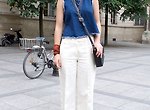 멀티컬러 스트라이프 팬츠와 블루 발렌티노 가방이 산뜻하고 러블리하다. 옷차림이 간편한 여름에는 모자나 슈즈, 컬러풀한 가방등 소품을 적절히 활용하면 훨씬 생동감있는 여름 데일리룩 코디를 완성할 수 있다.